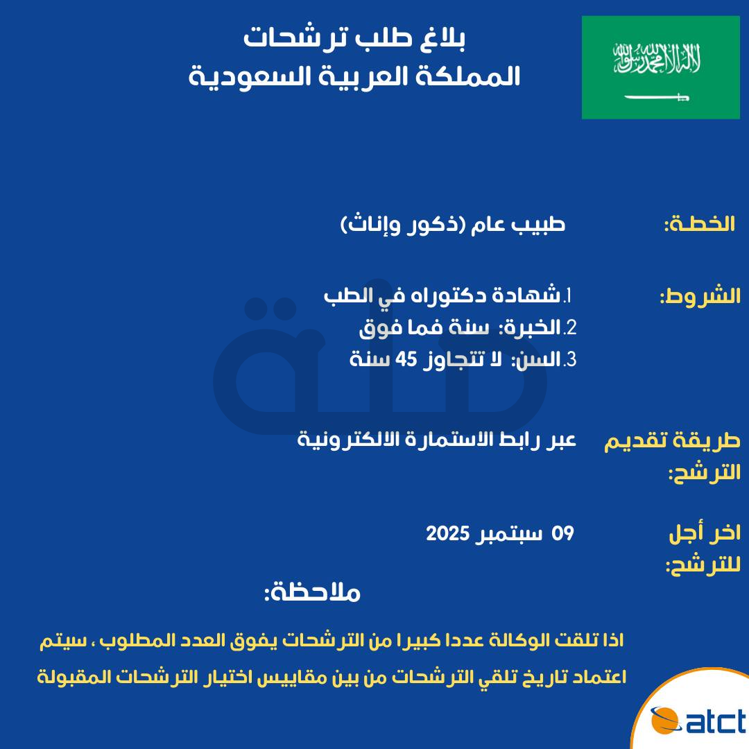 تعلم الوكالة التونسية للتعاون الفني عن رغبة المملكة العربية السعودية في انتداب طبيب عام (ذكور وإناث)