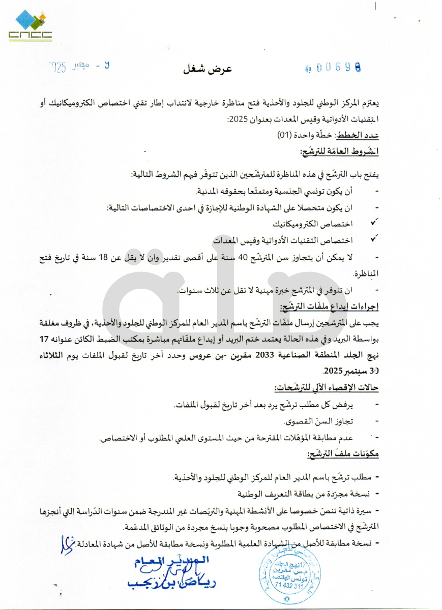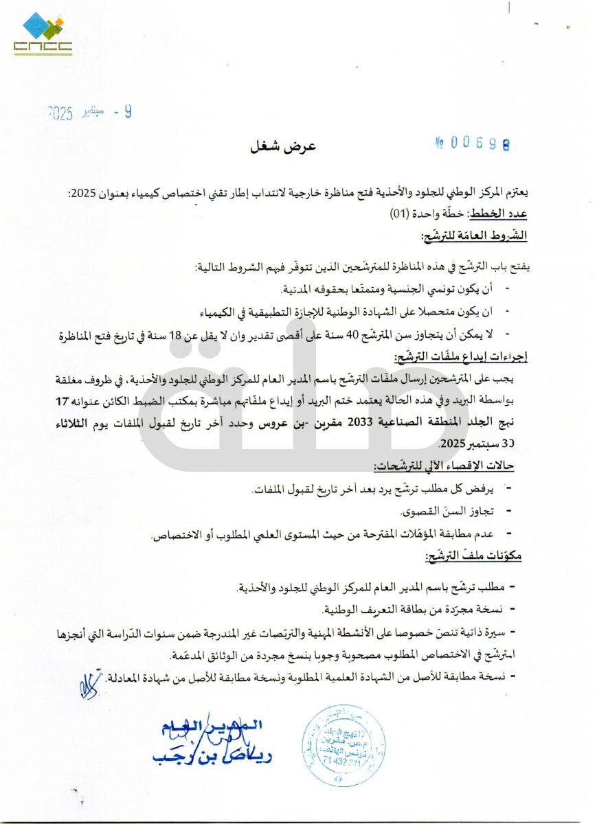 Mohamed يعتزم المركز الوطني للجلود والأحذية فتح مناظرة خارجية لانتداب؛ - إطار تقني اختصاص الكتروميكانيك أو التقنيات الأدواتية وقيس المعدات بعنوان سنة 2025، عدد الخطط: خطّة واحدة (01) - إطار تقني اختصاص كيمياء بعنوان سنة 2025، عدد الخطط: خطّة واحدة (01)