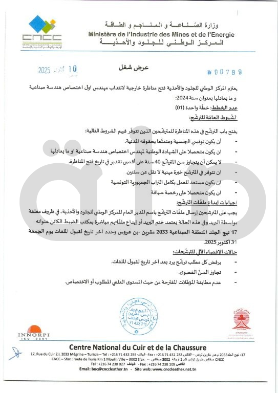 BnaserD المركز الوطني للجلود والأحذية فتح مناظرة خارجية لانتداب مهندس اول اختصاص هندسة صناعية و ما يعادلها بعنوان سنة 2024