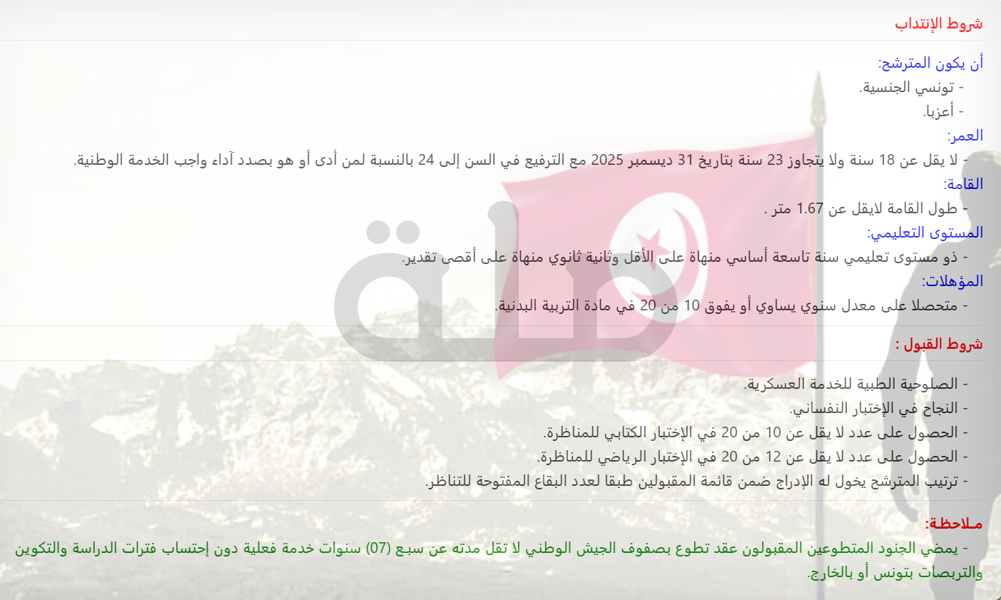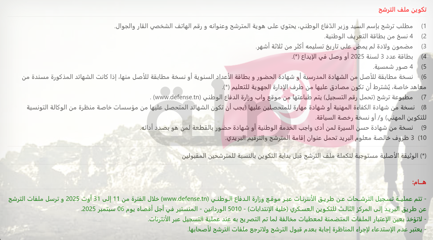 Mohamed الجمهـوريـة التـونسيـة وزارة الـدفـاع الوطنـي إنتداب جنود متطوعين مباشرين لجيش البر (فتيان) تسجيل مطلب الترشح: https://services.defense.tn/emat2025/pdl/pdl_inscri/