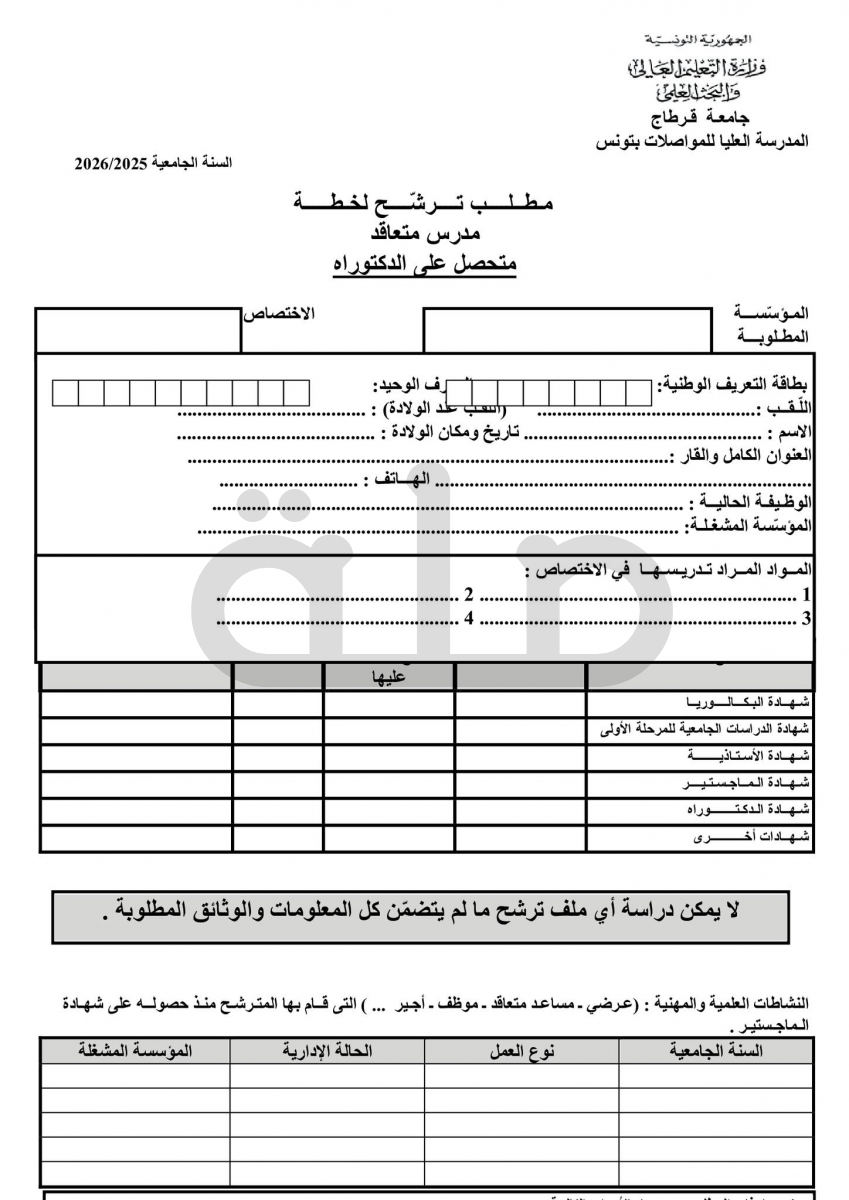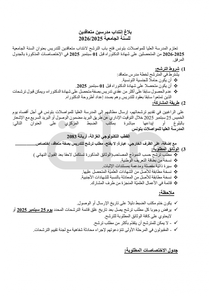 Sup'Com إنتداب مدرسين متعاقدين للسنة الجامعية 2025/2026