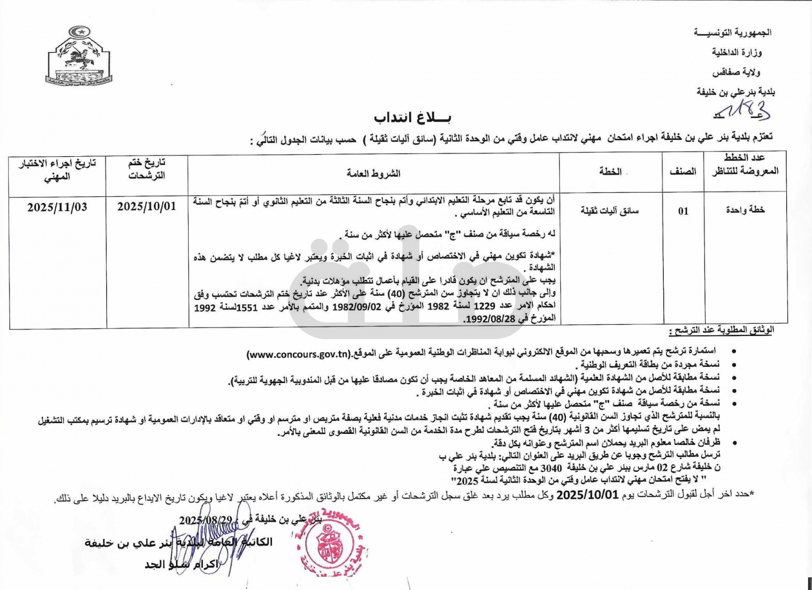 مرجع المناظرة : قرار عدد 44 يتعلق بفتح امتحان مهني لانتداب عامل وقتي من الوحدة الثانية المؤرخ في 16/07/2025 بعنوان سنة 2025